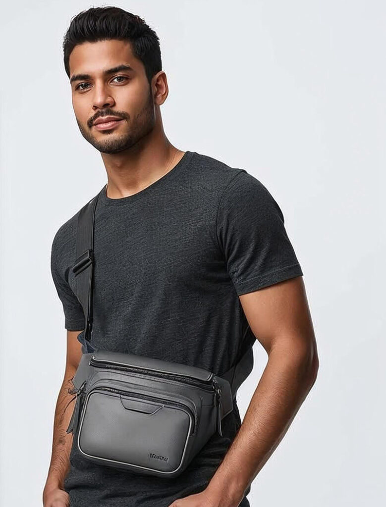 • กระเป๋าหนัง สีเทาอ่อน → โทนมินิมอล เรียบง่าย แต่แฝงความหรู เหมาะกับแฟชั่นสมัยใหม่